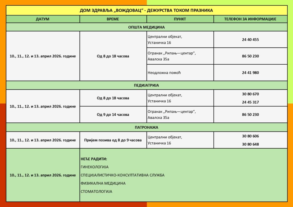 Лекари опште медицине дежураће 10., 11., 12. и 13. априла 2026. године у централном објекту на адреси Устаничка 16 (011/24 40 455) и у огранку „Рипањ – центар“, Авалска 35а (011/86 50 230), од 8 до 18 часова. За неодложну помоћ грађани могу позвати број 011/24 41 980.