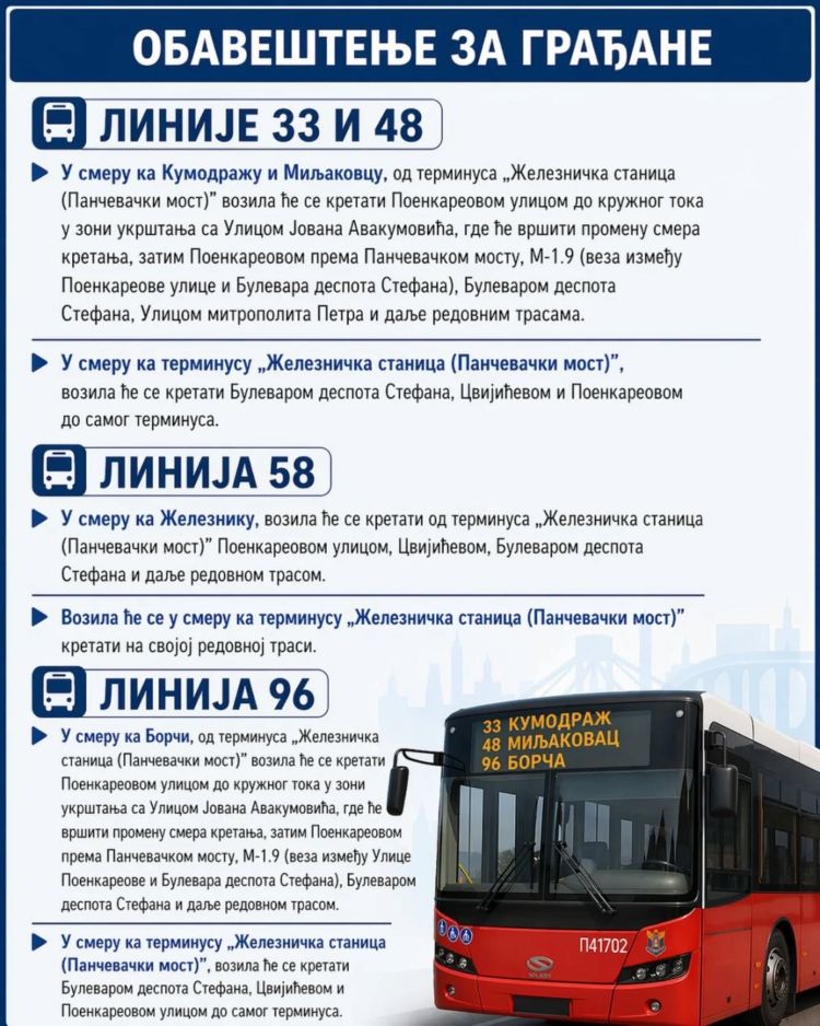 Градска општина Палилула обавештава грађане да је дошло до измене режима саобраћаја на линијама 33, 48, 58 и 96, због чега ће возила у одређеним правцима саобраћати измењеним трасама.